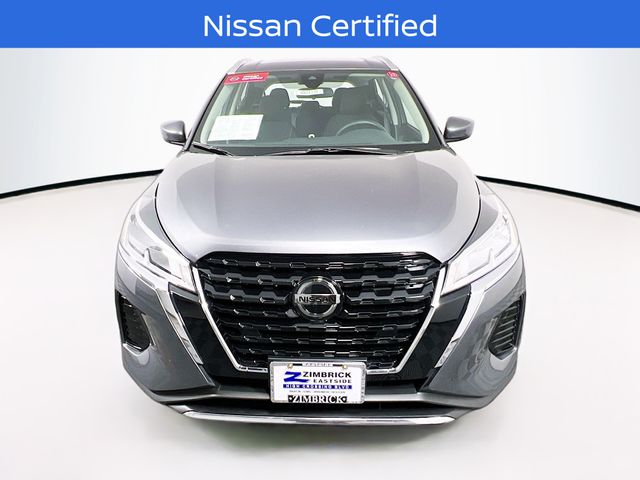 Certified. Gun Metallic 2021 Nissan Kicks SV FWD CVT with Xtronic 1.6L 4-Cylinder DOHC 16V 3.927 Axle Ratio, 4-Wheel Disc Brakes, 6 Speakers, ABS brakes, Air Conditioning, Alloy wheels, AM/FM radio: SiriusXM, Apple CarPlay/Android Auto, Auto High-beam Headlights, Automatic temperature control, Blind Spot Warning, Brake assist, Bumpers: body-color, Carpeted Floor Mats w/Cargo Mat, Cloth Seat Trim, Compass, Driver door bin, Driver vanity mirror, Dual front impact airbags, Dual front side impact airbags, Electronic Stability Control, Front anti-roll bar, Front Bucket Seats, Front Center Armrest, Front reading lights, Front wheel independent suspension, Fully automatic headlights, Heated door mirrors, Illuminated entry, Knee airbag, Low tire pressure warning, Occupant sensing airbag, Outside temperature display, Overhead airbag, Panic alarm, Passenger door bin, Passenger vanity mirror, Power door mirrors, Power steering, Power windows, Radio data system, Radio: AM/FM Audio System, Rear Parking Sensors, Rear reading lights, Rear side impact airbag, Rear window defroster, Rear window wiper, Remote keyless entry, Roof rack: rails only, Speed control, Splash Guards Grain (4 Piece), Split folding rear seat, Sport steering wheel, Steering wheel mounted audio controls, Tachometer, Telescoping steering wheel, Tilt steering wheel, Traction control, Trip computer, Variably intermittent wipers, Wheels: 17" 5-Hole Alloy.